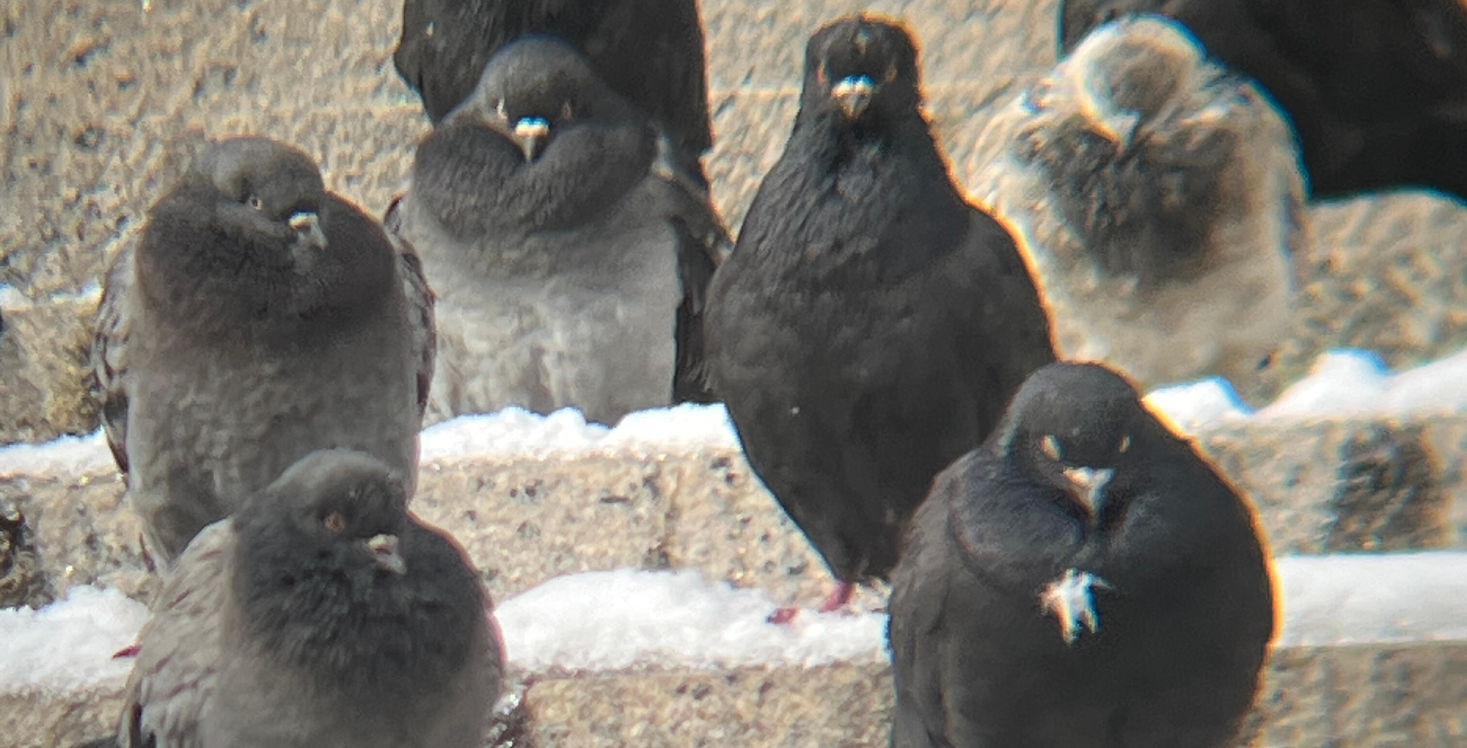 Pigeons huddle in the snow near Penn Station.